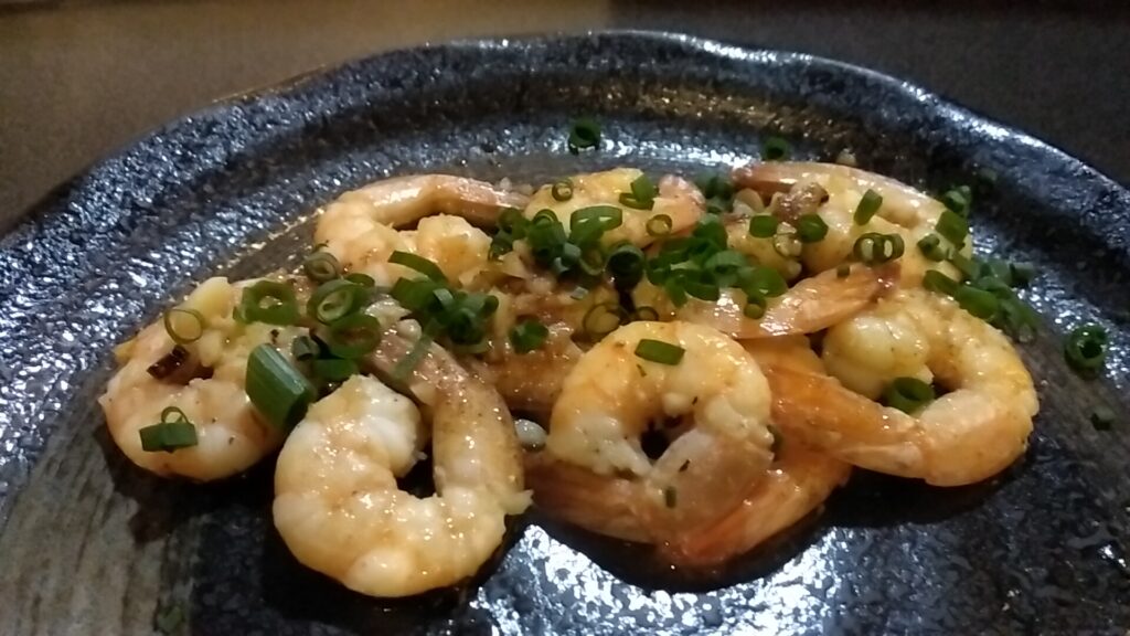 地鶏柚子胡椒とエビガーリックも頼んでみましたが、どちらもとても美味しく、特に地鶏の柚子胡椒は素晴らしく美味しかったです(店内が暗く、どの画像も写りが悪くて申し訳ありません💧)。