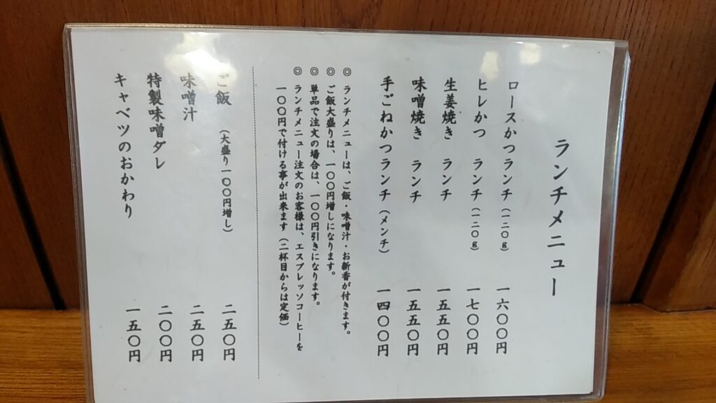 お店の入口にあるメニューを確認しましたが、お昼はランチ営業をしていて、一番高いヒレかつでも千円台で食べられます(現金のみ)。
